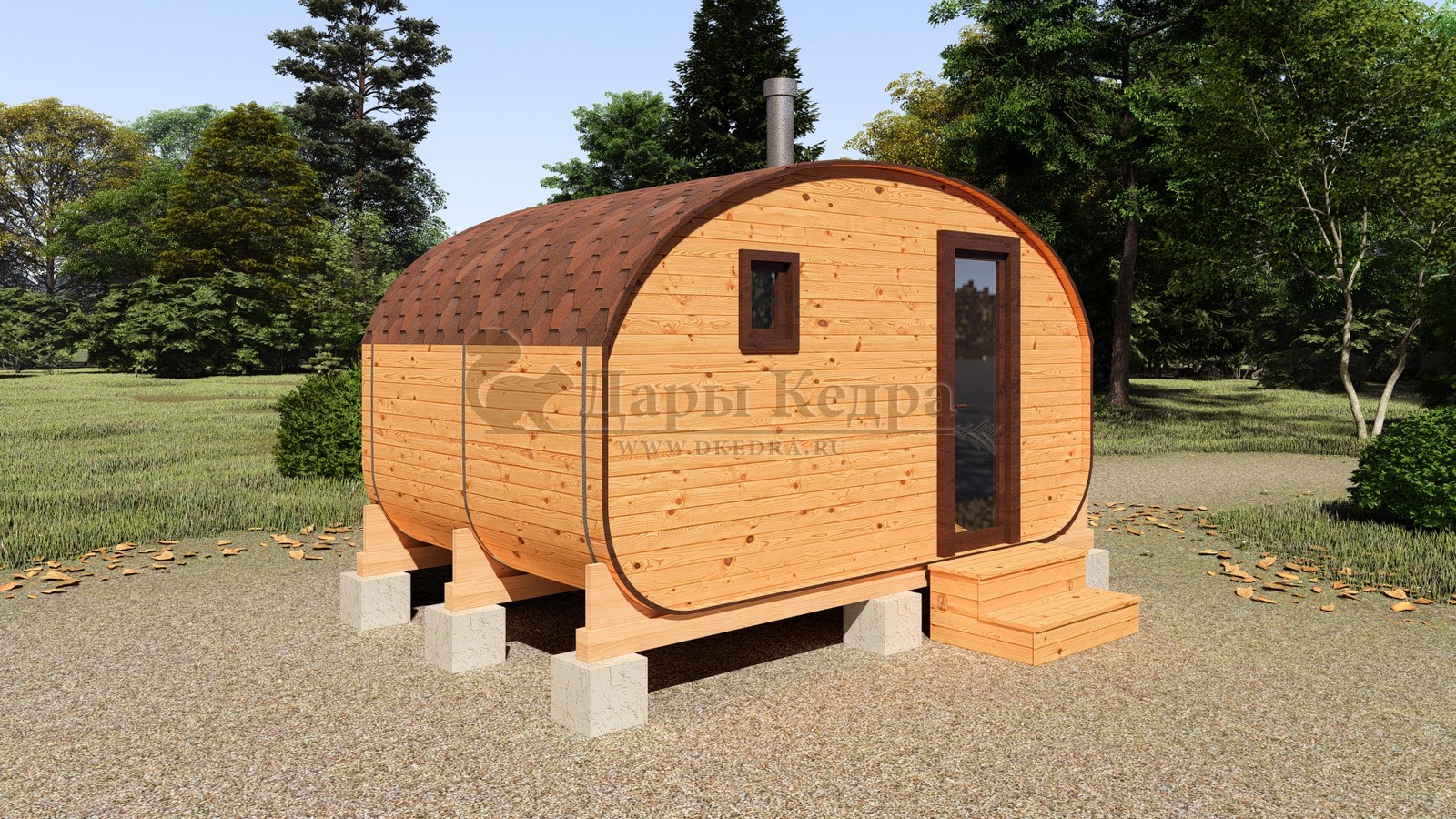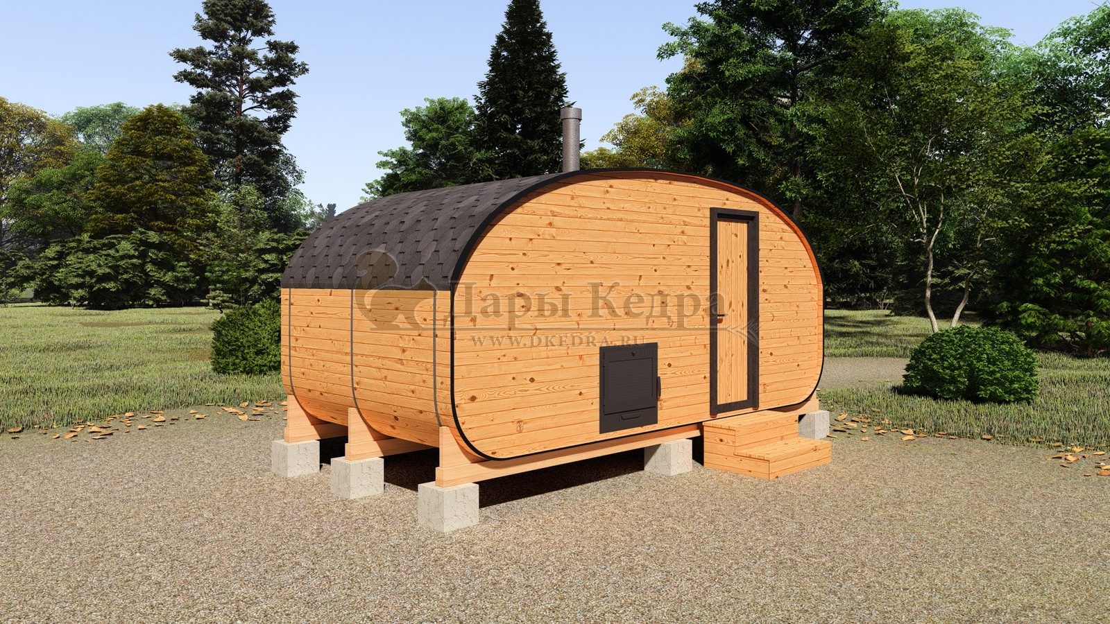 Баня-бочка буханка из кедра 4 метра Это более просторная модель за счет увеличенной высоты потолков и ровного пола. В такой модели раздевалка совмещена с моечной. Тут установлен душевой поддон, вешалка, полочка и лавочка из кедра. В парильном отделении по обе стороны расположены двухуровневые открытые полки, печь находится между ними у дальней стены. Время растопки такой бани не превышает 30 минут. По вашему желанию баню-бочку можно укомплектовать козырьком, верандой и печью с внешней загрузкой, благодаря которой весь мусор во время топки остается на улице. Баня-бочка буханка не требует полноценный фундамент, поэтому при необходимости ее можно перенести в другое место. Обращаем Ваше внимание, что в стандартную комплектацию бани входят полки открытого типа в парной с обеих сторон. Дополнительно можно заказать полок закрытого типа или лавку! Кедр обладает ароматическими свойствами. Он не деформируется и влагоустойчив, при правильном уходе за деревом на нем не развиваются грибки и плесень.