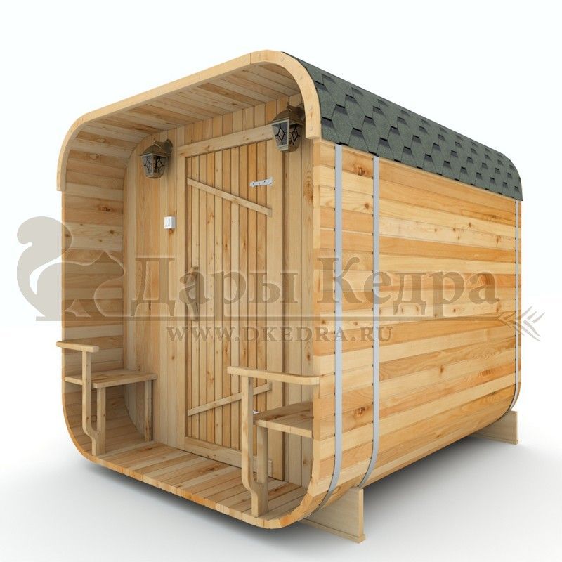 Баня-бочка буханка из кедра с козырьком (все размеры) Баня-буханка более просторная за счет увеличенной высоты потолков и ровного пола. Козырек не только украшает баню, но и защищает оставленную обувь от дождя. Лавочки из кедра находятся по всей длине бани-бочки с обеих сторон. Печь расположена в парилке около дальней стены. Время растопки такой бани не превышает 30 минут. В зависимости от выбранного размера баня-бочка буханка с козырьком имеет следующую комплектацию: Баня-бочка буханка 2,5 метра - парилка; Баня-бочка буханка 3,5 и 4,5 метра - раздевалка, парилка; Баня-бочка буханка 5,5 метров - раздевалка, парилка, моечная. По вашему желанию ее можно укомплектовать печью с внешней загрузкой, благодаря которой весь мусор вовремя топки остается на улице. Баня-бочка буханка не требует полноценный фундамент, поэтому при необходимости ее можно перенести в другое место. Обращаем Ваше внимание, что в стандартную комплектацию бани входят полки открытого типа в парной с обеих сторон. Дополнительно можно заказать полок закрытого типа или лавку! Кедр обладает ароматическими свойствами. Он не деформируется и влагоустойчив, при правильном уходе за деревом на нем не развиваются грибки и плесень.