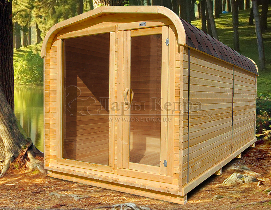 Баня-бочка «Пентагон» с панорамным окном Стильная и современная баня-бочка может быть выполнена длиною от 4 метров, с двумя отделениями (парилка и комната отдыха). Полок может быть, как с двух сторон, так и угловой, в стандарте двухуровневый. Печь в данной модели расположена сбоку с топкой внутрь парилки, либо наружу или в соседнее помещение. Печь можно укомплектовать баком для воды, а саму баню сделать длиною до 6 метров, комфортно разместив в ней дополнительно помывочную. Панорамное окно на входе добавит света и уюта в раздевалке. Установив баню в живописном месте, во время процедур можно наслаждаться видами из окна. В эту модель включено одно закаленное квадратное стекло в комнате отдыха. Обращаем Ваше внимание, по умолчанию в данной модели отсутствует бак для воды, вместо него идёт утеплённая термо-труба, которую можно заменить на бак по желанию.