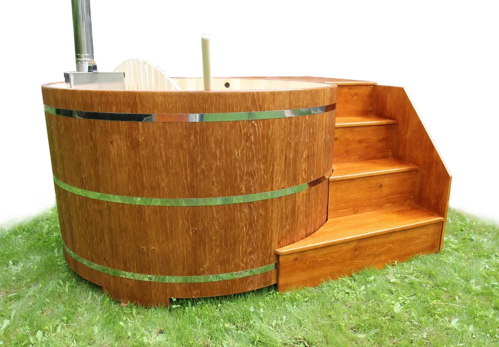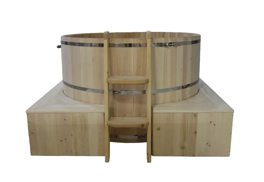 Это уличная баня, которой можно пользоваться круглый год. Купель представляет собой круглую емкость для воды, внутри которой располагаются сиденья из кедра. Подогрев воды осуществляется приставной печью с дымоходом. Для удобства пользования японская баня фурако оборудована внешней и внутренней лестницей из кедра.