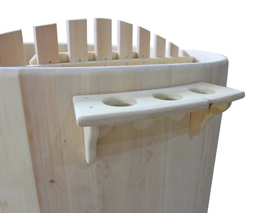 Полка крепится к борту с внутренней части купели. Будет удобна для напитков, посуды, или любых других не очень больших, но нужных вещей.