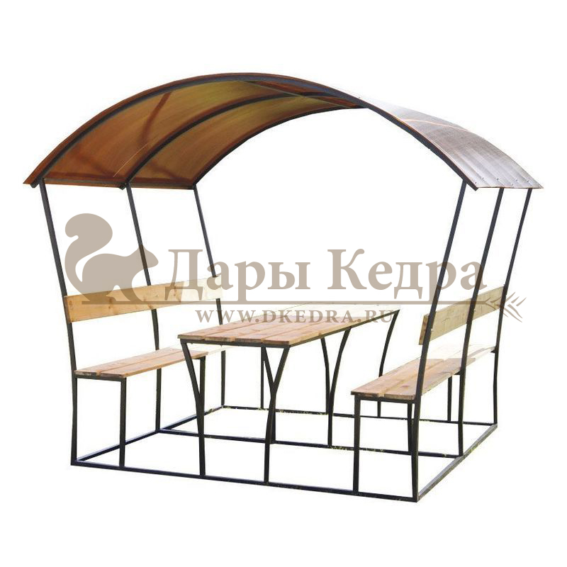 Беседка из металла и поликарбоната Беседка выполнена из стальной квадратной профильной трубы 40х40 мм. Лавки и стол обшиты кедровой доской. На крыше - поликарбонат. Беседка отличается простотой в установке, легкостью конструкции, долговечностью, прочностью и классическим дизайном, который впишется в любой интерьер приусадебного участка. Вокруг такой беседки можно организовать ландшафт из вьющихся растений, которые красиво создадут зеленые 'стены' снаружи и уют внутри. Размер стола у разных моделей варьируется в зависимости от ширины конструкции.
