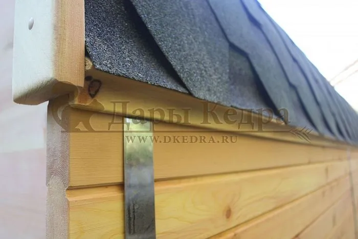 - Гибкая черепица на круглых моделях сделана так, чтобы вода с крыши стекала, не задерживаясь на стенах. В квадратных банях-бочках, буханках, где есть прямые участки стен, желательна установка капельников, которые препятствуют намоканию стен при проливных дождях. В каркасно-щитовых конструкциях крыша покрывается ондулином, капельники не устанавливаются.