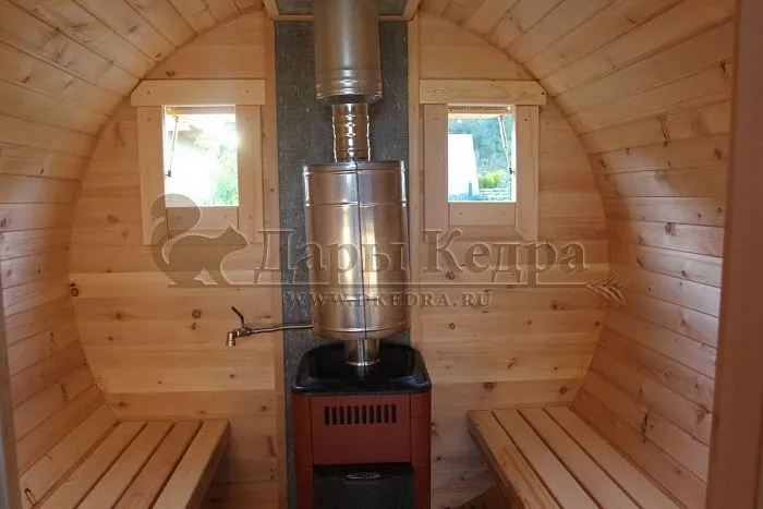 - Бочкообразные конструкции отличаются от своих соотечественников формой, поэтому пар равномерно распределяется внутри парной, а значит такая модель особенно быстро нагревается даже в мороз.