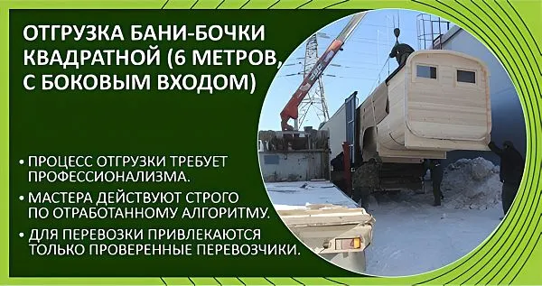 - Доставка бани должна быть четко регламентирована и согласованы все детали проезда с перевозчиком. Про особенности погрузки и разгрузки читайте в статьях: "Баня-бочка с доставкой на дом!" и "Доставка мобильных бань".