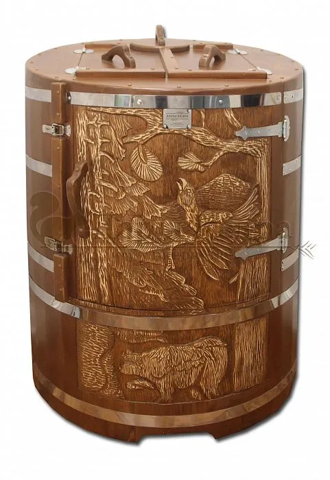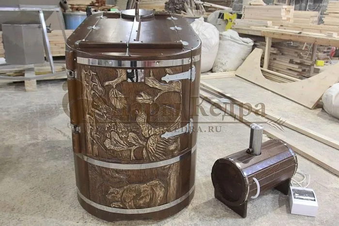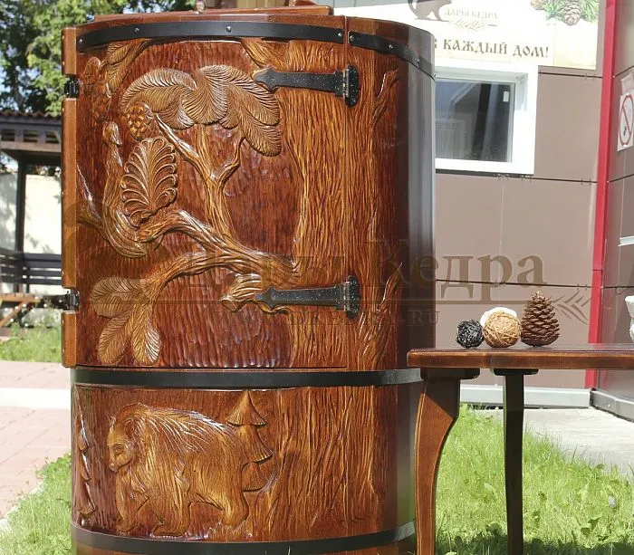 И, конечно, стоит отметить мастеров компании, осуществляющих профессиональную резьбу на древесине фитобочки или купели. Изделие с художественным оформлением - это выбор ценителей красоты, индивидуальности, эко-стиля. Бочка с резьбой станет объектом всеобщего внимания. Можно выполнить тонирование рисунка или окрашивание всей бочки в круговую и выделение рисунка сделать отдельно с помощью осветления. Таким образом, более светлый контур резьбы будет смотреться очень ярко на темной фитобочке. Все работы по художественному оформлению проводятся мастерами вручную, никаких станков!